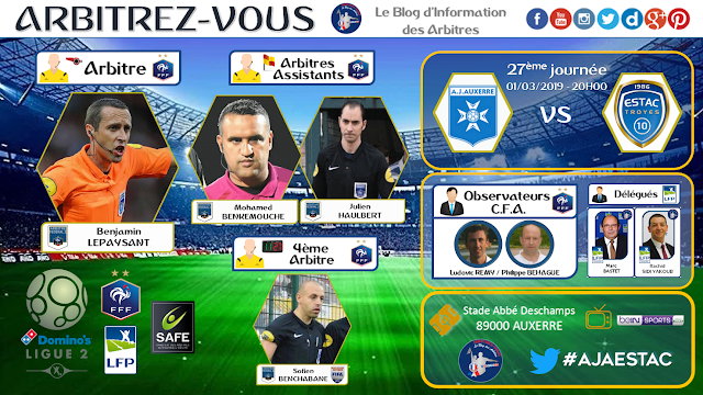 Publié le 27/02/2019 - La DTA a procédé à la désignation des Arbitres et Assistants pour la 27ème journée de Ligue 2 qui aura lieu les 1,2,3 et 4 mars 2019.