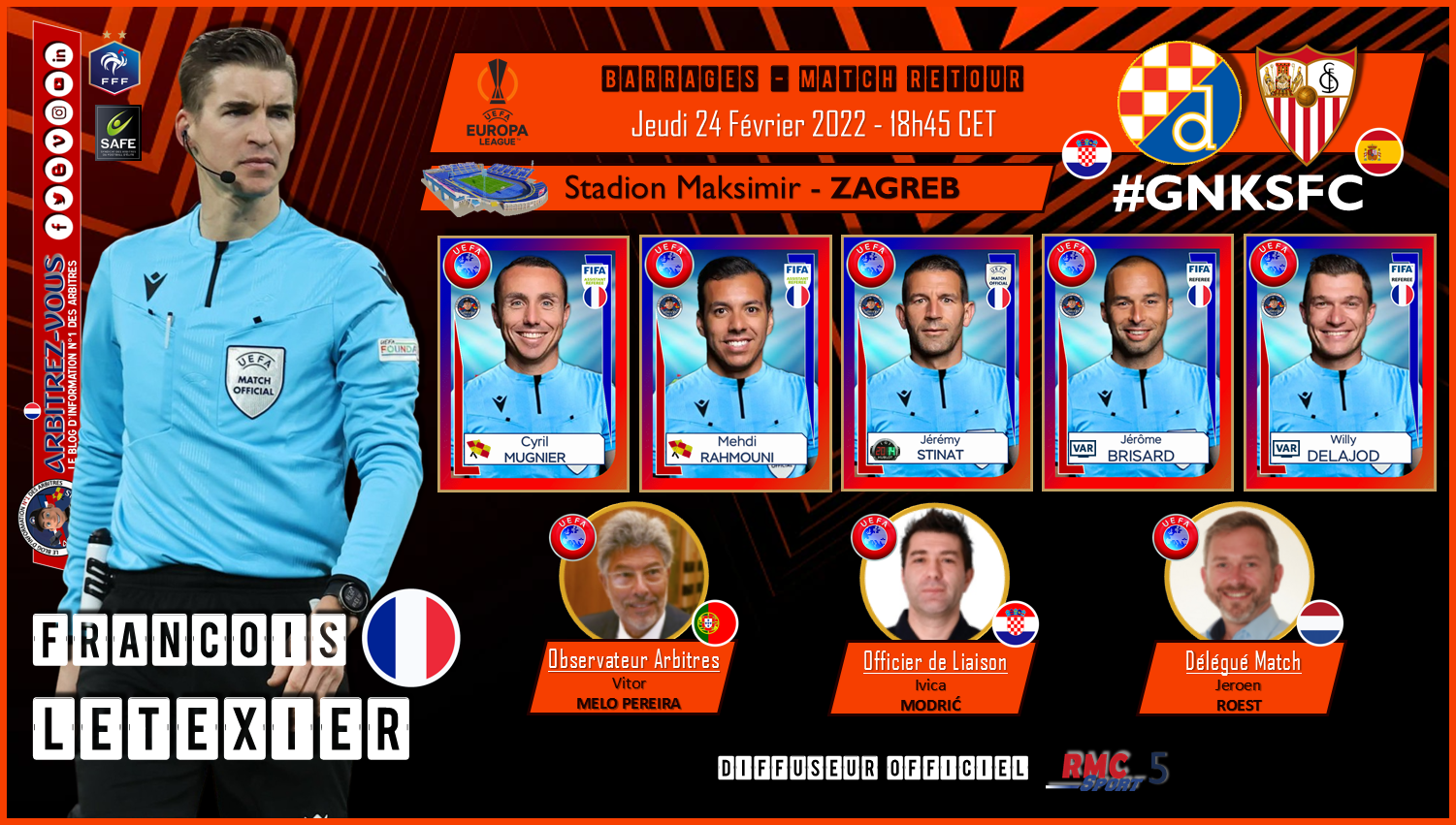 Publié le 24/02/2022 - La Commission des Arbitres de l'UEFA a procédé à la désignation des Arbitres pour les matchs de Barrages Retour de l'UEFA EUROPA LEAGUE qui se dérouleront le 24 février 2022.